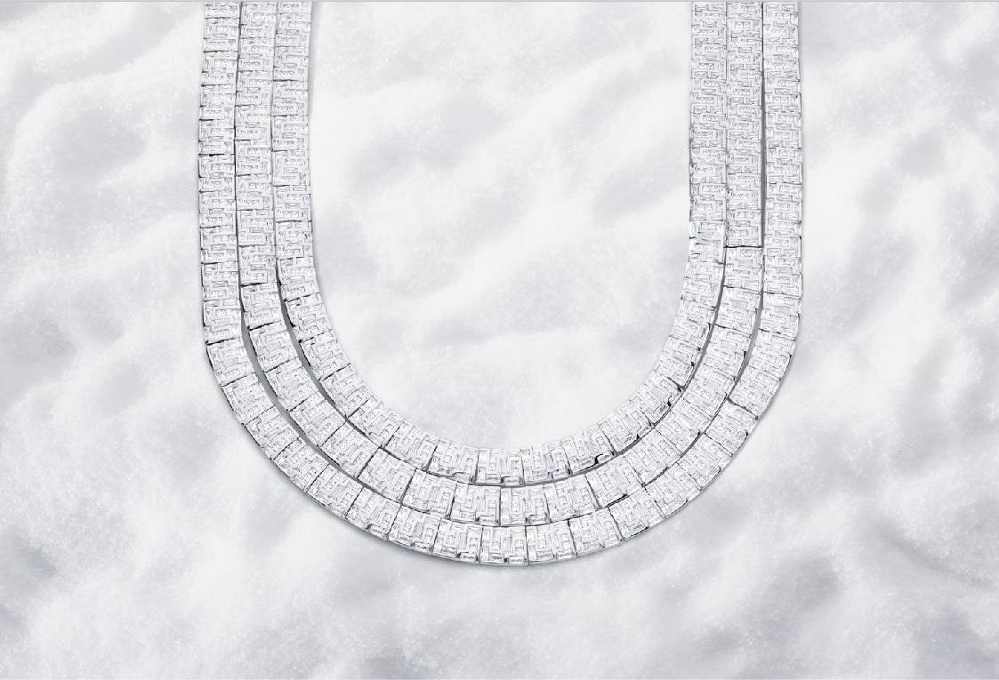 HIVER系列的创作灵感源于冬季自然景致的微妙变化与动人细节。设计师从浪漫纷飞的雪花,滑冰鞋在冰面上留下的轨迹,滑雪板在斜坡上划过的曲线,以及冰裂的几何纹理,这些冬日的“魔法”转化为品牌独特的设计语言。雪花不再只是六角形的重复,而是几何线条与现代审美重新演绎,既保留其自然形态的灵动,又赋予其时尚的简约精致;冰块的晶莹透亮则通过多层次镶嵌工艺与立体镂空结构得以再现,搭配冷色调与银白闪锆的巧妙结合,在光线折射下呈现出冬晨霜露般的清澈质感。这一系列的设计不仅是对冬季元素的提炼,更是对其内在精神的深度挖掘——寒冷中的坚韧、静谧中的生机,都与APM Monaco所倡导的"于平凡中发掘不凡"的品牌哲学不谋而合。