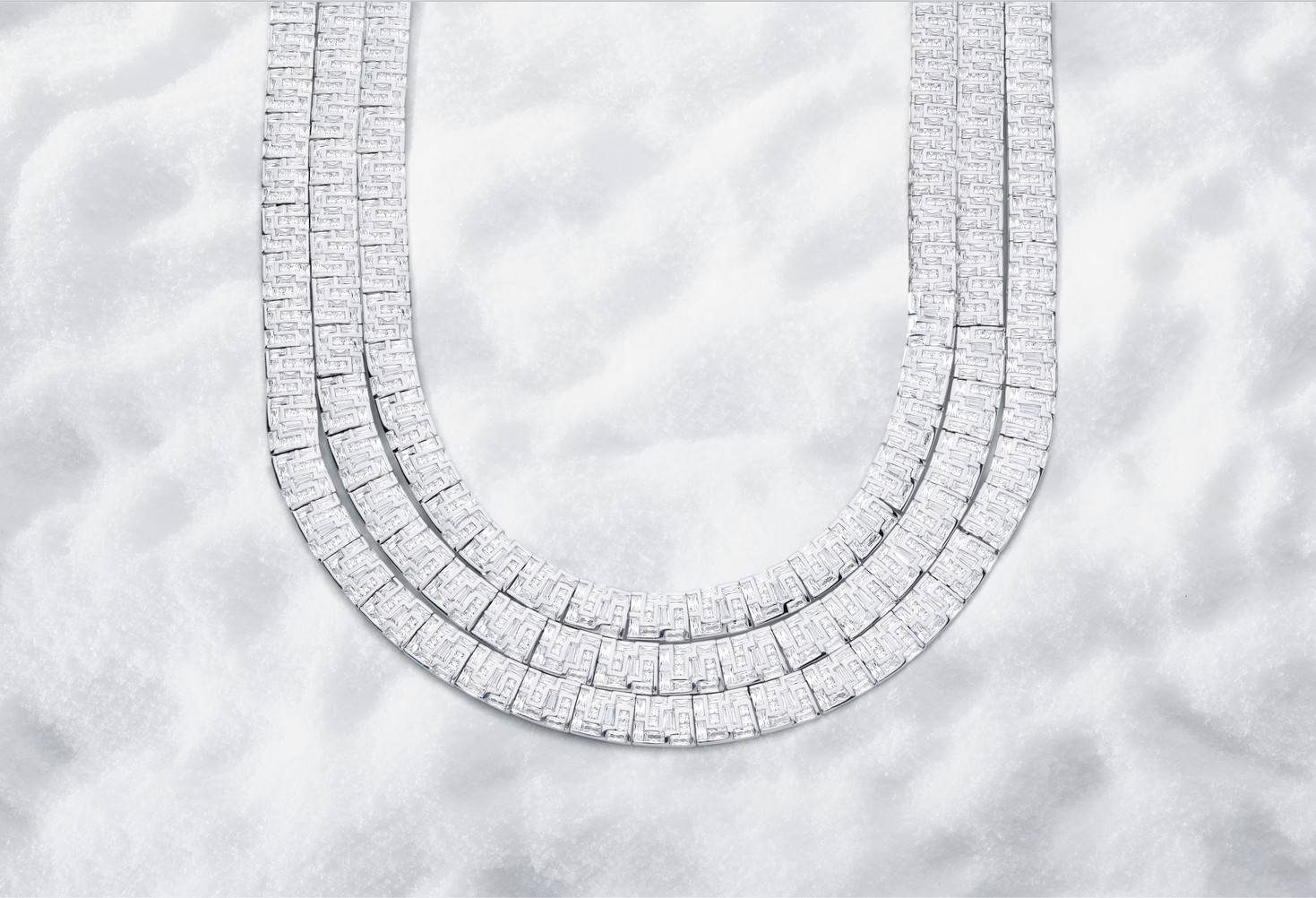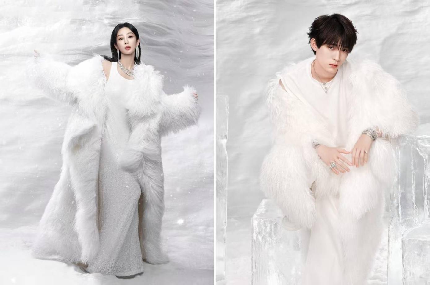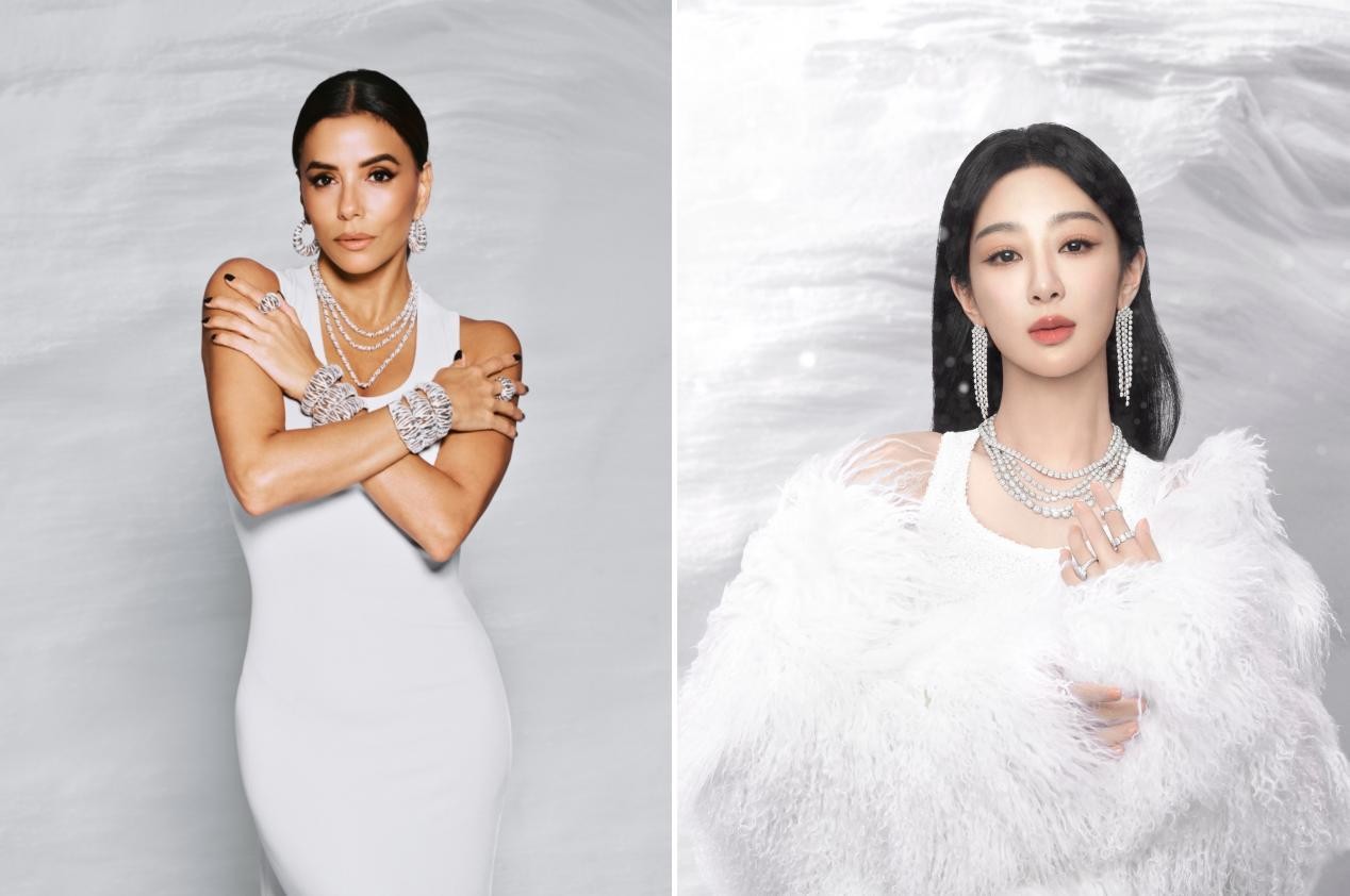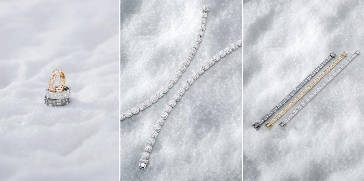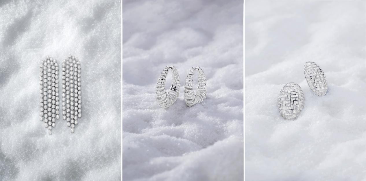 在工艺与设计的结合上,HIVER系列延续了APM Monaco对匠心精神的坚持。每一件作品均由品牌工匠手工打造,从雪花的微镶工艺到冰块的镂空雕琢,无不体现着对细节的极致追求。该系列项链,轻盈设计,模拟出雪花飘落的柔美姿态;而Ice系列耳饰的透亮设计,则通过精准的角度计算与层次叠加,再现了冰凌的清澈与立体感。在广告大片的视觉呈现中,品牌通过极简的雪白背景与暖金色光影的交织,模拟出冬日从清晨到黄昏的光线流转,模特佩戴珠宝的姿态仿佛被风吹起的雪屑,又似阳光穿过冰面的耀眼瞬间,每一帧画面都传递出冬日的沉浸魅力与诗意氛围。