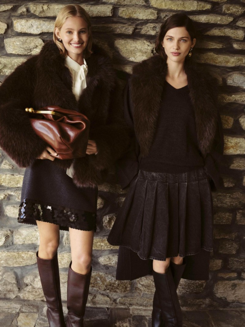 以廓形与搭配,塑造假日节奏。短款外套搭配利落裙装,形成清晰而有力的轮廓对比。挺括剪裁在柔和光线下展现结构美感。深棕与巧克力色调呼应冬日自然景致,使整体造型在从容与优雅之间取得平衡。