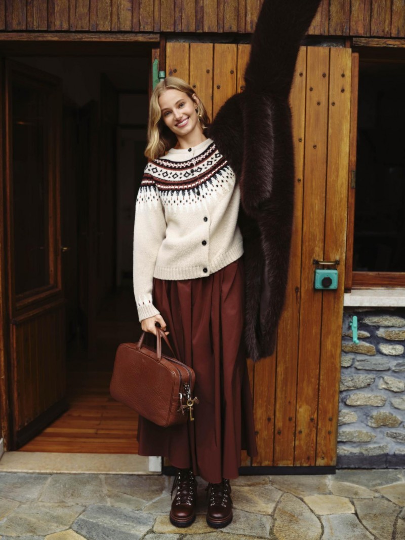 以材质为起点,勾勒冬日触感。大地色系贯穿造型基调。柔软针织、细腻羊毛与富有垂坠感的面料相互叠搭,在视觉与触感之间营造出舒适而安心的节日氛围,为假日着装奠定温暖底色。