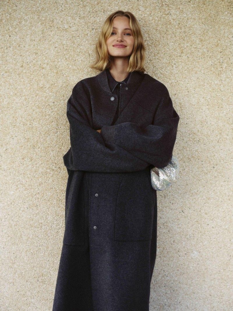 以细节单品,定格假日情绪。深色衬衫外搭宽松的深灰色长款外套,纽扣与口袋细节赋予造型自然层次。银色Pasticcino甜品包作为点睛之笔,在粗粝墙面映衬下释放低调光泽。