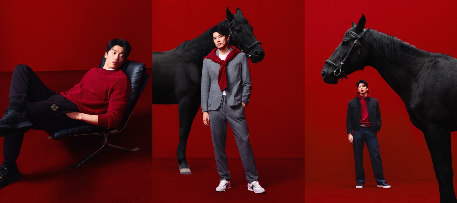 BOSS马年新春系列将金饰工艺的独特魅力融入全品类单品,涵盖夹克、针织衫、卫衣、T恤、Polo衫和牛仔裤,以及男士内衣和袜子等,通过标志性纹样与满印图案淋漓呈现。整体以红、白、黑为主色调,缀以金色线条勾勒,在鎏金质感中达成奢华传统与现代风格的平衡共生。一件真皮拉链夹克尤为亮眼,运用激光雕刻再现古代錾花工艺的立体装饰效果,成就奢华点睛之作。这一设计语言延伸至提花羽绒马甲、天鹅绒提花毛衣和激光印花牛仔裤,延续品牌对传统工艺的创新诠释。帽衫与卫衣则借印花与刺绣呈现繁复层次图案,致敬花丝镶嵌技艺;细密金珠点缀其间,再现炸珠技艺之美。每件单品均赋以中式雅称,让非遗韵味融入日常穿着,尽显东方雅意。
