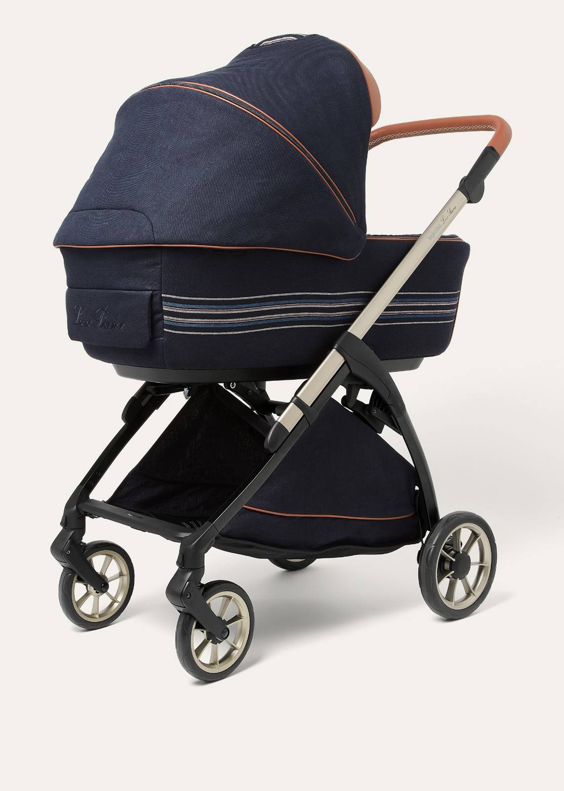 精美的婴儿推车由防水亚麻和棉质帆布制成,采用精致考究的海军蓝色,饰有 Loro Piana 品牌经典 Suitcase Stripe 图案,实用而不失优雅风范。图案的色泽采用 Loro Piana 标志性 kummel 色,极简却不失辨识度,该色调源自品牌贸易商在旅行途中所用的行李箱,反映出品牌的悠久传统。手柄处的皮革细节成为精致而颇具现代感的点睛之笔。这款婴儿推车轻量、实用且紧凑的设计使其可轻松单手折叠携带,将实用主义精神贯彻始终。