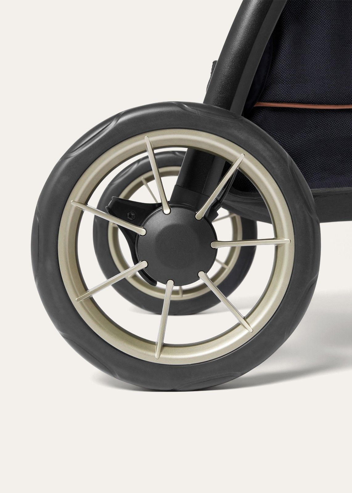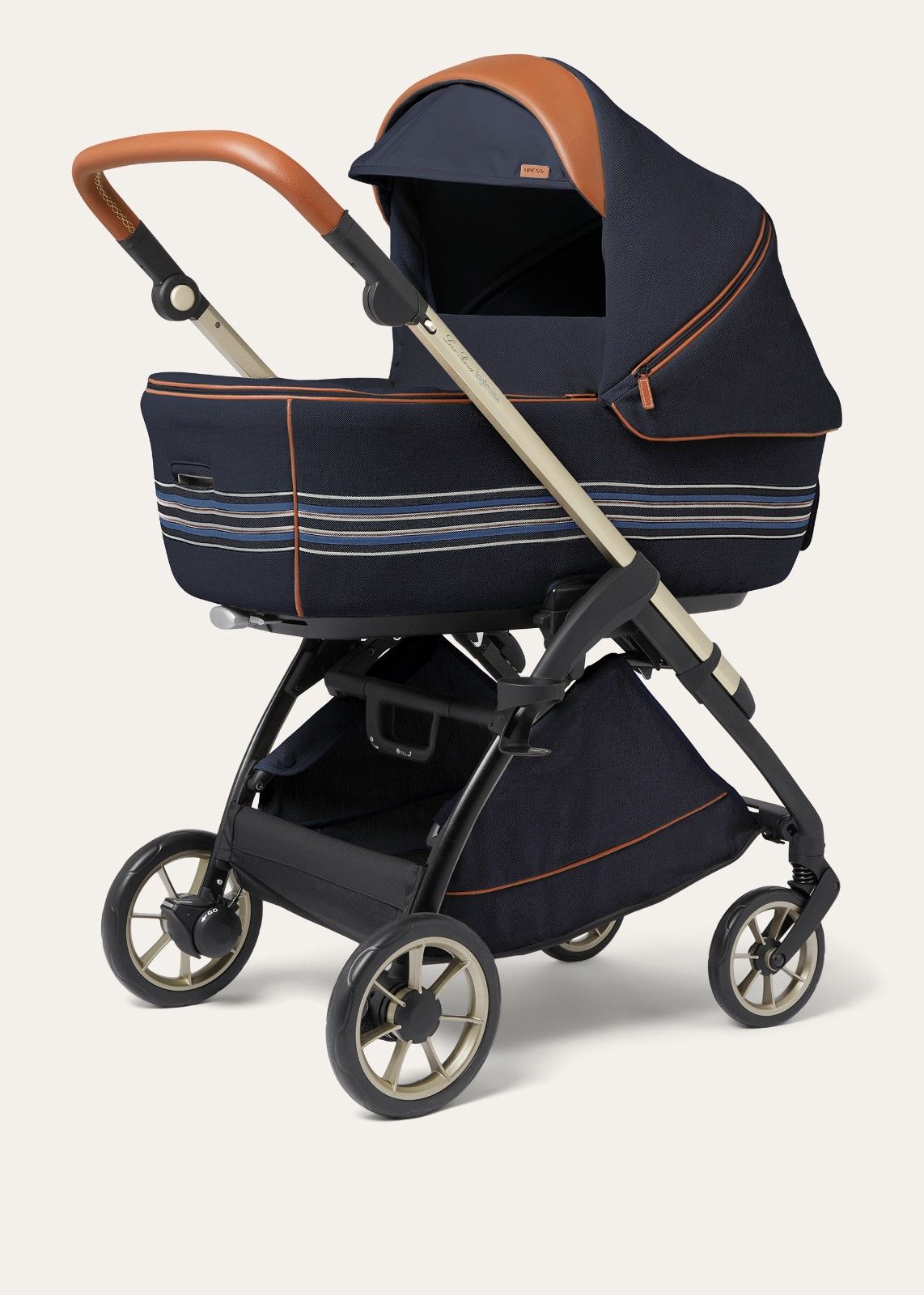 婴儿推车的座椅与睡篮均可搭配可拆卸的 Cashfur 冬季套件使用。该套件包含婴儿睡垫与父母暖手配件,采用品牌标志性的羊绒混纺少量桑蚕丝工艺纺制,确保在寒冷季节为父母与宝宝带来无尽的柔软呵护。同系列海军蓝妈咪包饰以标志性条纹图案,与婴儿推车设计完美呼应,呈现协调统一的整体造型。