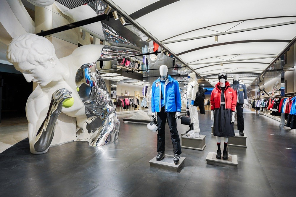 外立面以罗马斗兽场建筑为灵感,沉积岩材质的经典拱门结构象征罗马文明的深厚底蕴,也叙说着品牌的意大利基因。门口伫立的巨型雕塑以《掷铁饼者》对竞技瞬间的经典定格为灵感,与店内取意自《朱利亚诺·德·美第奇像》、身披FILA经典网球单品BB1大满贯 POLO的另一座雕塑遥相呼应 —— 一个手掷网球,一个手持球拍,共同演绎《网球新章》主题。品牌基因中源自古罗马竞技文化的力量感与秩序美,在当代运动语境中得以延续。