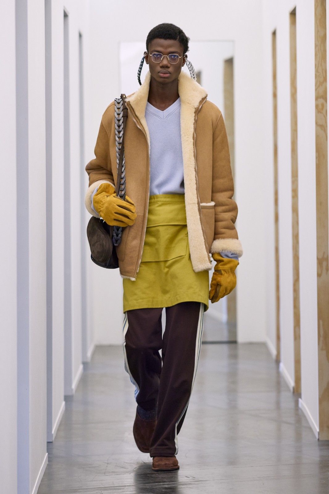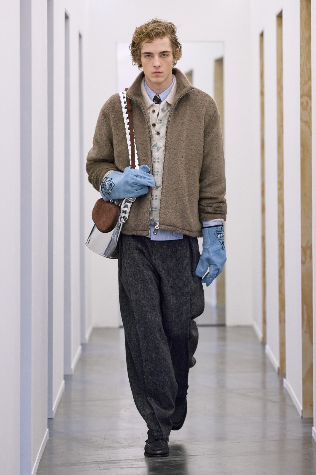 本系列植根于经典男装准则,经提炼、调整并刻意营造不安定感。通过参考办公室场景下的冬季叠穿,剪裁被赋予新的体量。切斯特菲尔德大衣、精准的衬衫与领带组合以及定制夹克,建立起熟悉的框架。裤装通过深褶、宽大的翻边引入体积感和动感。花呢、鼹鼠皮、人字纹等传统面料强化了恒久感,并与暗示穿着、过渡和使用而非珍藏的轻盈姿态和瞬时感形成对比。