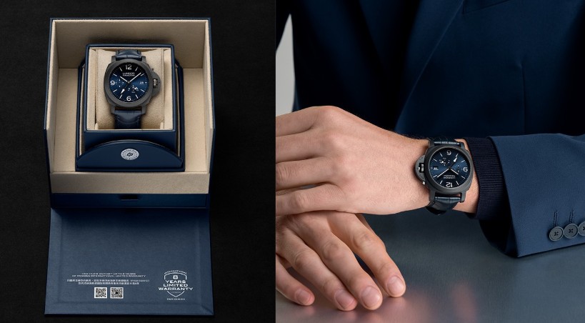 PAM01574配备一条蓝色鳄鱼皮表带,随附一条更具休闲气质的蓝色橡胶表带。两款表带及表扣均配备沛纳海表带快拆系统(PAM Click Release System™),无需使用任何工具,即可轻松完成表带的更换,可轻松适配多种场景,展现多样风格。