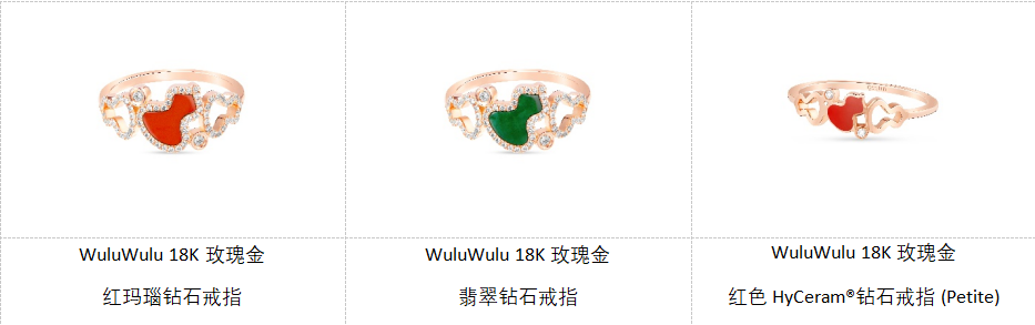 全新WuluWulu戒指以18K玫瑰金为基底,凝聚红玛瑙的温润质感与钻石的璀璨光华,焕发摩登气息。双镂空钻石葫芦环拥红玛瑙雕刻的Wulu造型,虚实交错间生出律动美感,重现WuluWulu 系列环环相扣的灵韵。