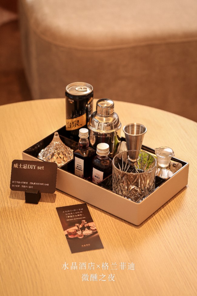 早在2023年,水晶酒店2.0版本就已率先将传统的行政酒廊改造为大堂的微醺社交空间,16款单一麦芽威士忌品鉴酒单一直深受客人喜爱。相较于传统高星酒店运营繁重的酒廊,水晶酒店采用轻量化的运营方式打造了很多创新体验。例如此次的格兰菲迪大师配方DIY特调,一整套专业酒具可送进客房,由客人随心调配。试想一下,在一天工作结束后,浴袍一穿,拖鞋一踩没有束缚地喝上一杯。轻松惬意,莫过于如此。