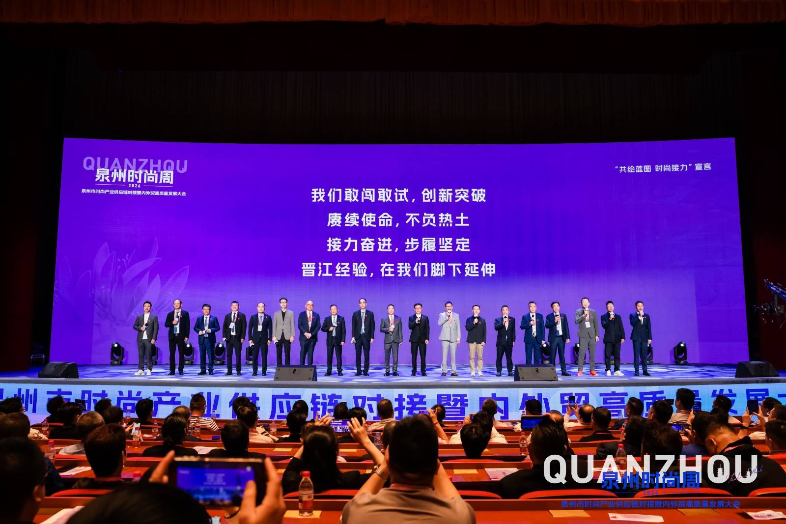 大会尾声,泉州时尚产业联盟主席团主席共同登台,发出“共绘蓝图 时尚接力”倡议。大家郑重承诺,将传承弘扬“晋江经验”,坚守实业、深耕主业,敢闯敢试、创新突破,以时尚为引领、以实干显担当,政企同心、接力奋进,从晋江出发、向世界作答,为爱拼敢赢的泉州精神续写新的时代荣光。誓言铿锵,气魄如虹,泉州企业家的薪火与担当,在此刻回响。