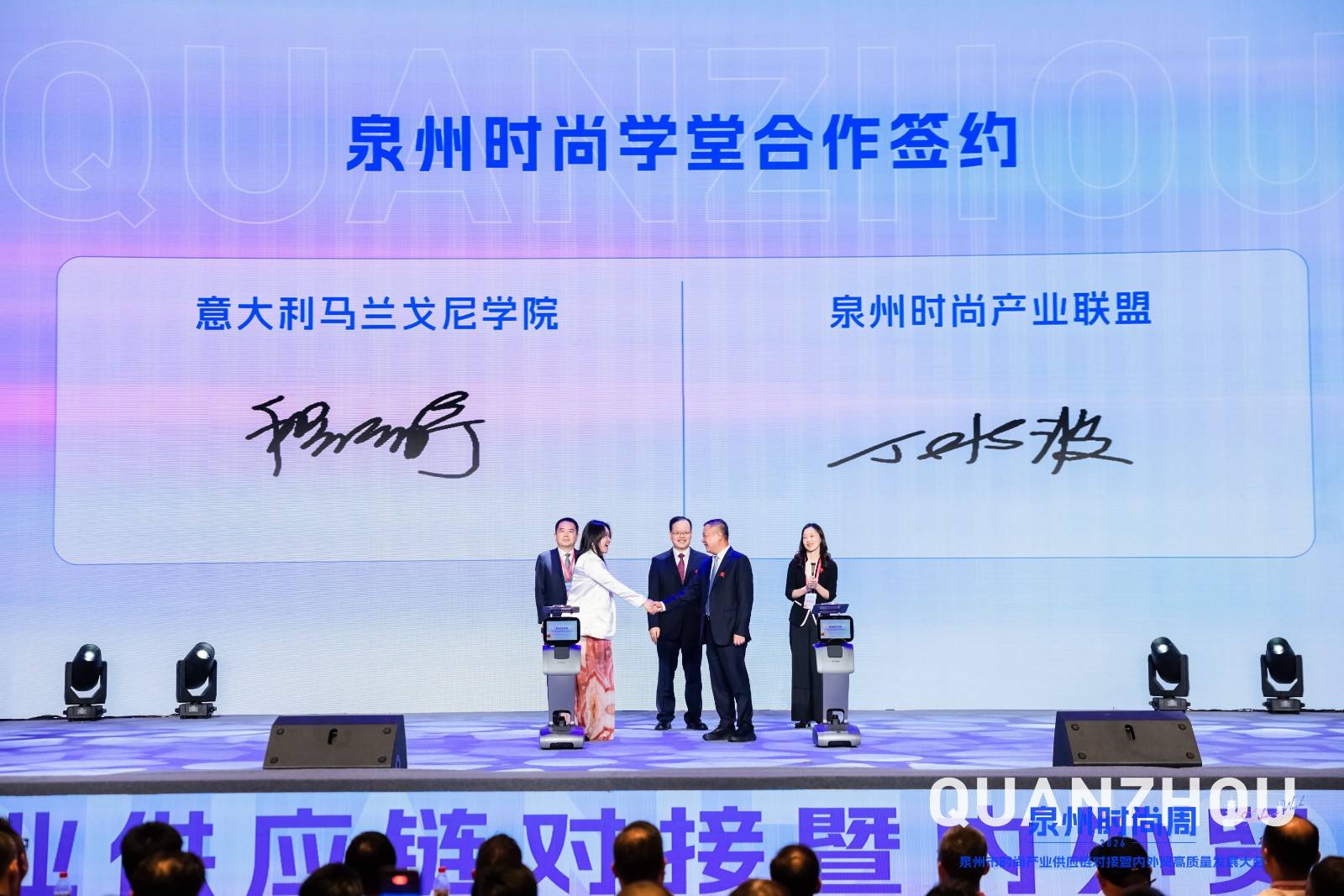 现场,泉州时尚产业会客厅正式揭牌启用;泉州时尚产业联盟与国际顶尖时尚院校联袂设立“泉州时尚学堂”,聚焦高端人才培养与国际设计交流,为泉州时尚产业的长远发展筑起智慧高地。会上还发布了海丝“衣创杯”服装设计大赛、世界美食之都“百城千店”推广计划,及“1+N”内外贸赋能平台。