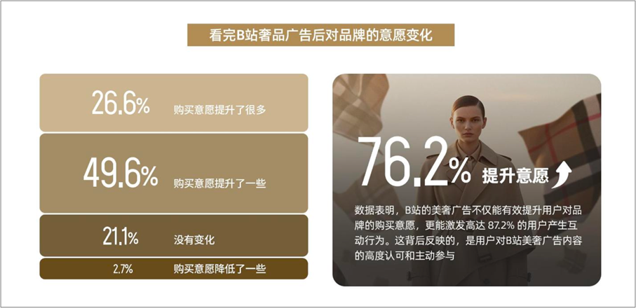 基于对平台生态与人群特征的深度洞察,报告发现,B站美奢广告可有效提高用户对品牌的购买意愿。76.2%的用户看完奢品广告后对品牌的购买意愿提升了,更是激发87.2%的用户产生互动行为。