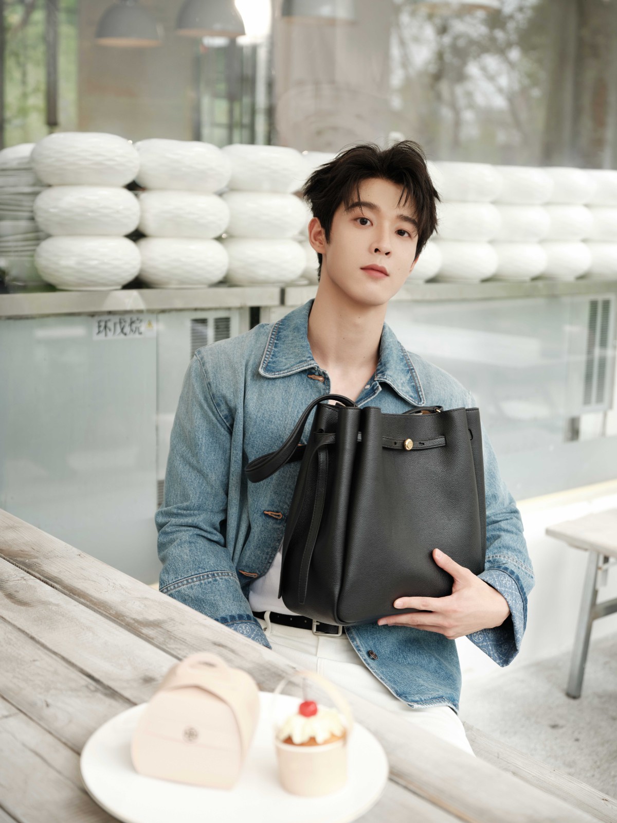 演员及歌手吴宇恒身着牛仔工装夹克,椭圆形太阳眼镜,LOGO贴片棒球帽,ROMY大号水桶包;