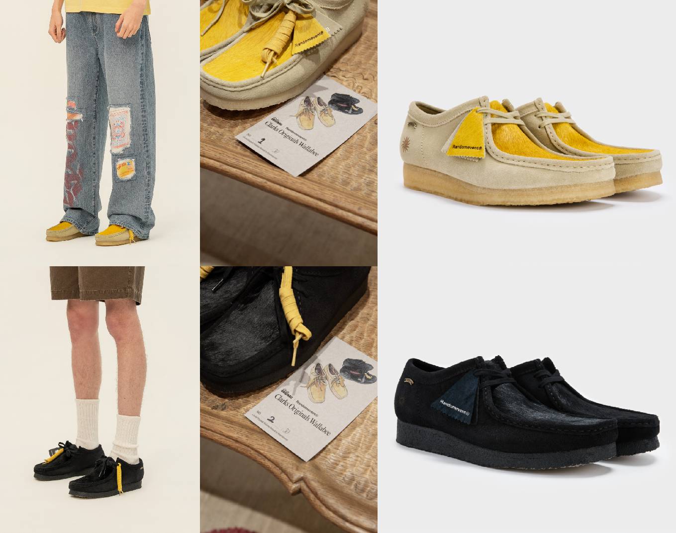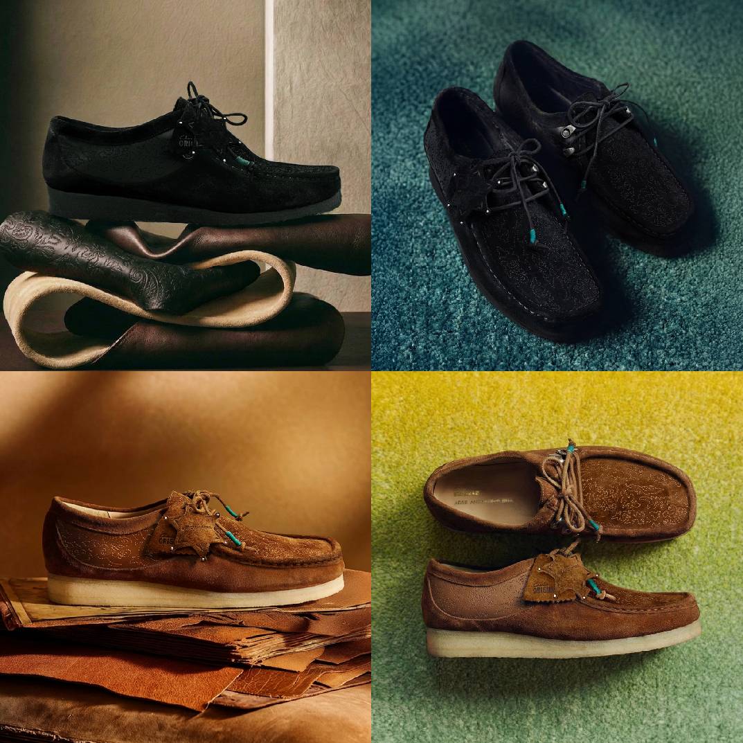 首先接入的,是一段强力的本土频率。Clarks Originals将Wallabee袋鼠鞋型作为原始文化样本,交由中国本土先锋品牌Randomevent进行一场原创性重写。此次Remake合作以“幸运马蹄铁(Lucky Horseshoe)”为核心概念,既呼应了中国传统马年氛围及马蹄铁象征幸运的寓意,也承接了Randomevent旗下「幸運店」所倡导的精神——在随机与不确定中依然保持积极,寻找属于自己的幸运感。设计将马蹄铁作为视觉与叙事的载体:一个特制的黄铜色金属铭牌如护身符点缀于鞋侧,铭刻有“RDET”字样;品牌标志性的山峦太阳图腾通过激光雕刻技术细腻呈现于皮革之上。系列提供两款配色:驼色鞋面大面积采用Randomevent标志性的黄色马毛皮革进行拼接,质感独特不羁;黑色则运用同色马毛皮革复合鞋面,呈现更为整体的百搭造型。随鞋附赠的黄色备用鞋带可作为点睛配饰,签名式的麂皮三角标背面烫印有产品基础信息。这不仅是对“幸运”的现代表达,更将「幸運店」所承载的本土文化与乐观哲学,从虚拟延伸至实体,让幸运成为一种随身相伴的“踏”实祝福。